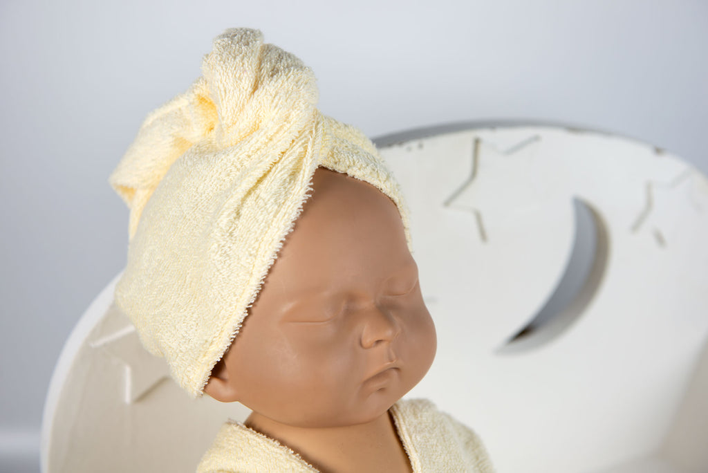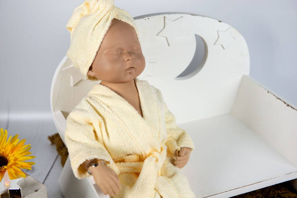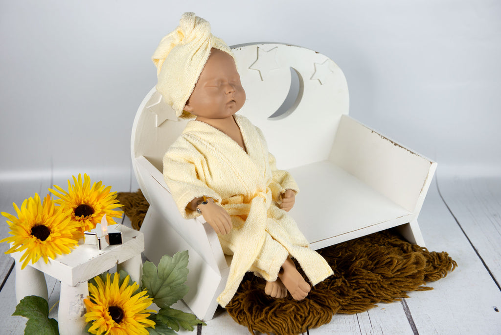A perfect outfit set for a relaxing spa newborn session. Adorable handmade newborn spa robe set. This robe remains open and can be wrapped around any baby tummy. This set is perfect for newborn photography or for baby's first bath. Made from a super soft, towel-like cotton fabric. This set does not offer much stretch, but is expandable due to it being a robe. Good enough to fit newborns 0-14 days old. Dress baby up in this outfit set and style with one of our Vintage Bathtubs.