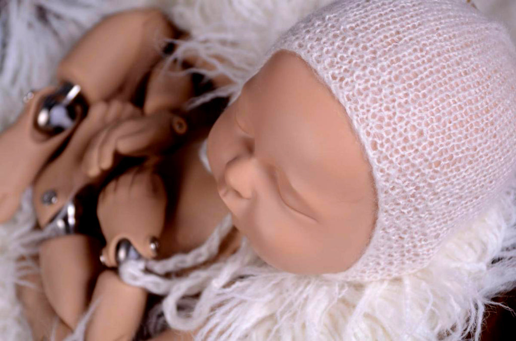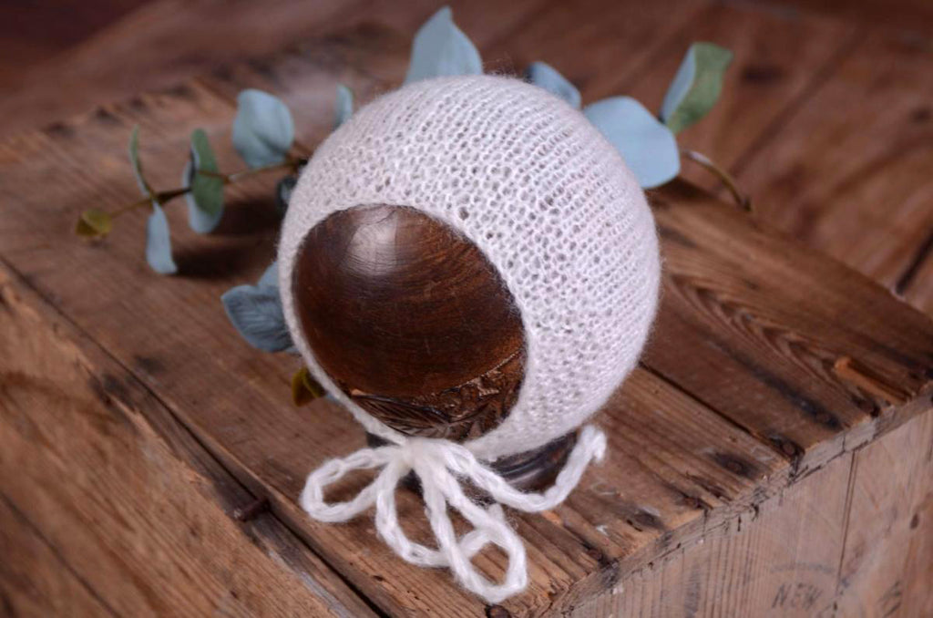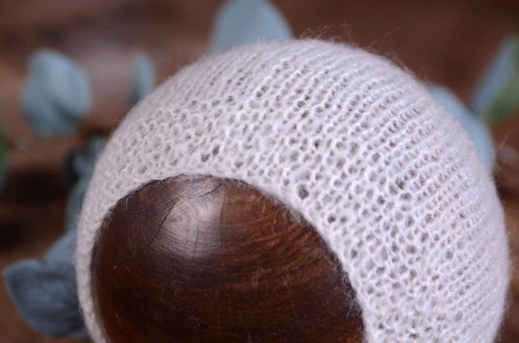 Our exquisitely soft and charmingly delicate Mohair Bonnet is thoughtfully designed to gently cradle the newest of newborns in a cocoon of warmth and softness. Each bonnet is expertly knitted using the finest mohair yarns, selected for their exceptional softness and slight elasticity, ensuring a snug yet gentle fit for your baby model. The timeless design of these bonnets provides a touch of serene elegance to any photo session.