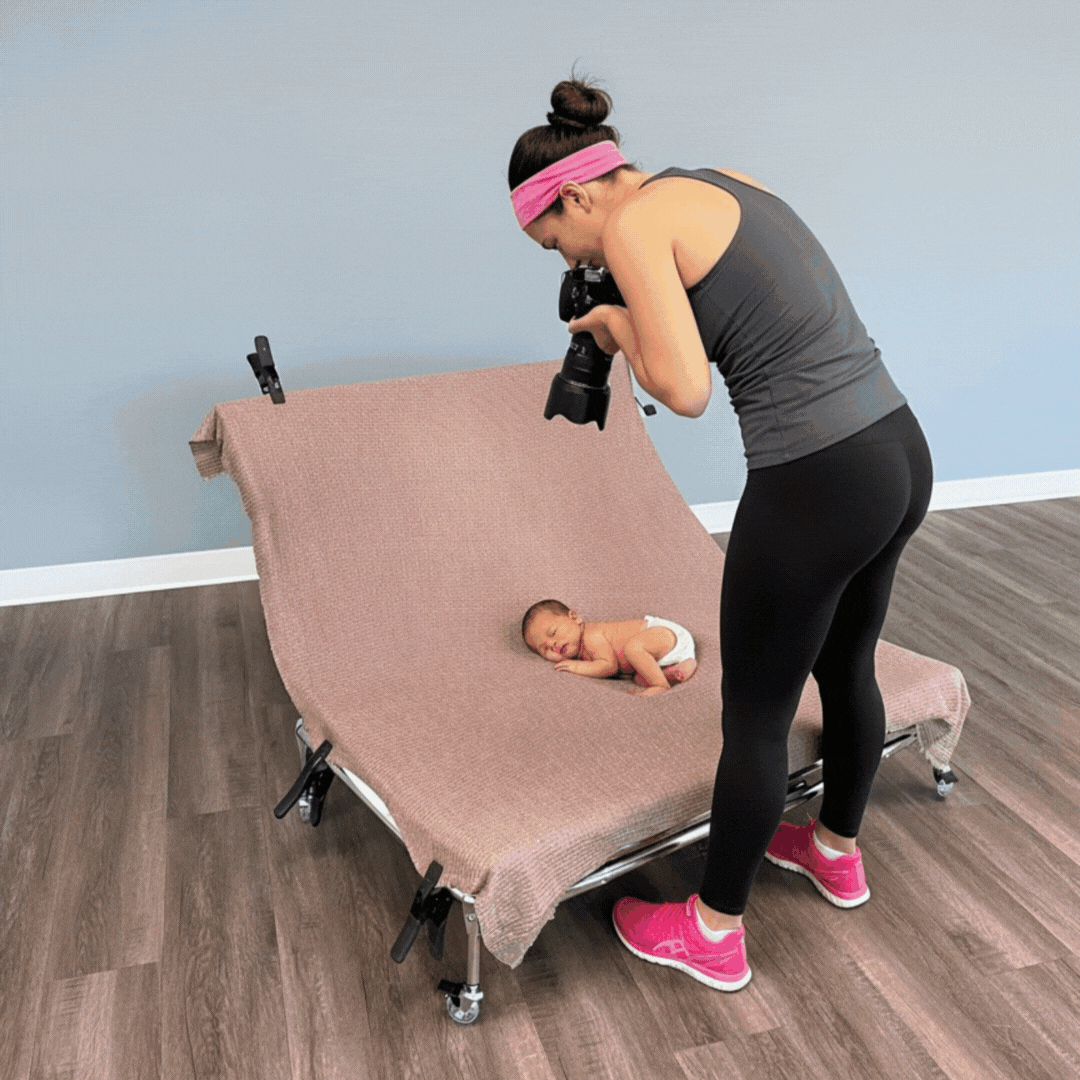 Adjustable Newborn Posing Table with wheels—essential for precise baby positioning in studio or on-location photography.